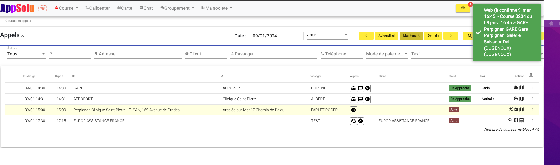 2 - Lors de la réception d'une course une dématérialisée, le standard voit la notification.: