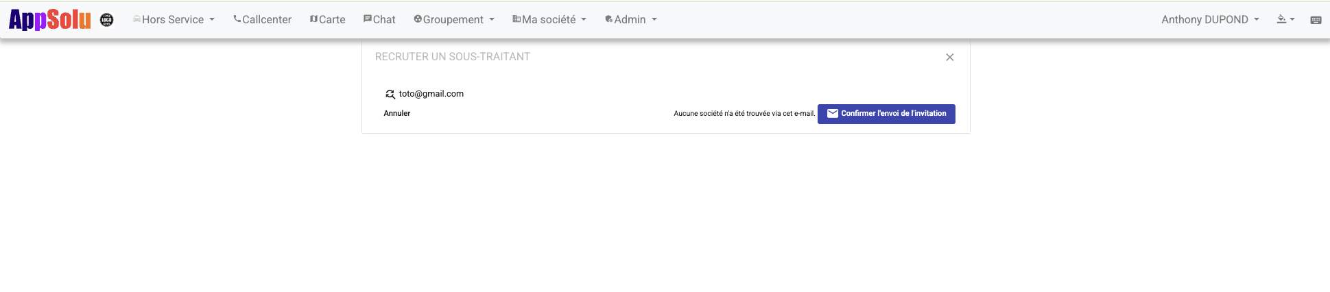 Entrez ensuite le mail de votre sous-traitant (celui qui est préalablement renseigné dans ses informations de facturation Appsolu présentes sur son espace BackOffice. Chemin d'accès : Groupement -> Information -> Facturation -> Email) et cliquez sur Rechercher cet email